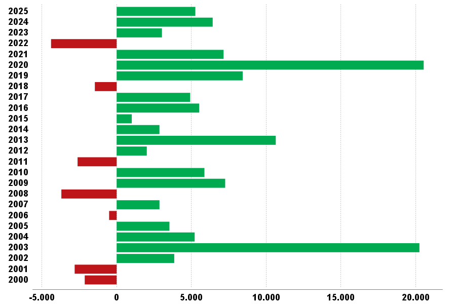 Die Rückrechnung seit dem Jahr 1999 zeigt für das Musterdepot der boerse.de-Megatrend-Aktien in 19 von 26 Anlagezeiträumen positive Ergebnisse, die bis zu 20.542 Euro Gewinn umfassten.