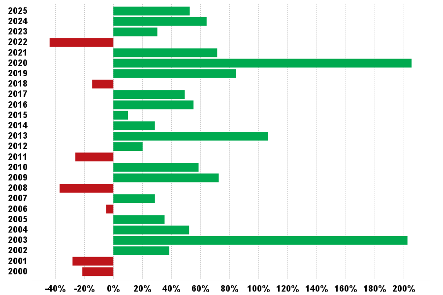 Das Musterdepot der boerse.de-Megatrend-Aktien hat in der Rückrechnung seit dem Jahr 1999 durchschnittlich 30,4% jährlich gewonnen.