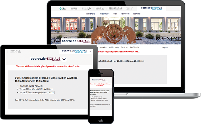Dank der boerse.de-Signale können Anlegerinnen und Anleger das vom BOTSI®-Advisor regelbasiert gesteuerte Musterportfolio für Aktien aus Deutschland, Österreich und der Schweiz bequem und einfach eins zu eins nachbilden. Denn Abonnenten erhalten alle Kauf- und Verkaufssignale des BOTSI®-Advisors sowie konkrete Empfehlungen zur Umsetzung.