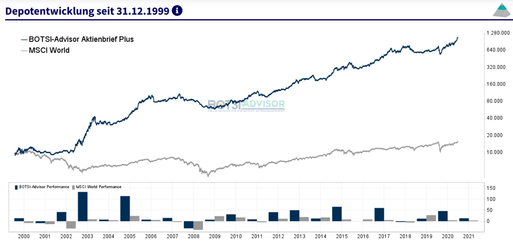Mit dem Schlussstand von 1.130.685 Euro erreichte das Musterdepot des boerse.de-Aktienbrief Plus am 26.01.2021 ein Allzeithoch, womit die Bestmarke hier nun schon den 5. Handelstag in Folge nach oben geschoben werden konnte. Historisch wurde das mithilfe des BOTSI-Advisors gesteuerte Musterdepot für boerse.de Aktienbrief Plus bis Ende 1999 zurückberechnet. Seitdem stehen im Schnitt jährliche Gewinne von 25,2% zu Buche, während der MSCI World im selben Zeitraum nur 2,3% p.a. gewann. Damit beträgt die Outperformance des BOTSI®-Advisors 22,9 Prozentpunkte p.a.!